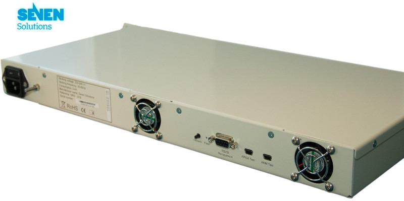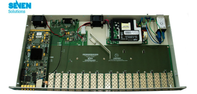 交换机主板:包含主要的电子元件、ARM 处理器、Xilinx FPGA 芯片、振荡器、存储器等。提供与 18 个 SFP 插槽、调试用的 USB-UART 端口、LED 指示灯等。