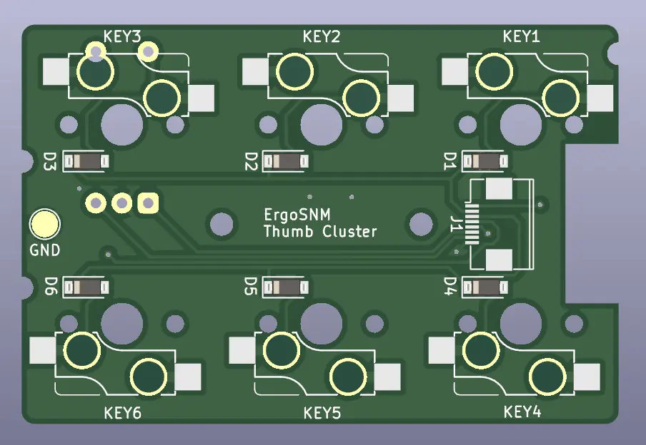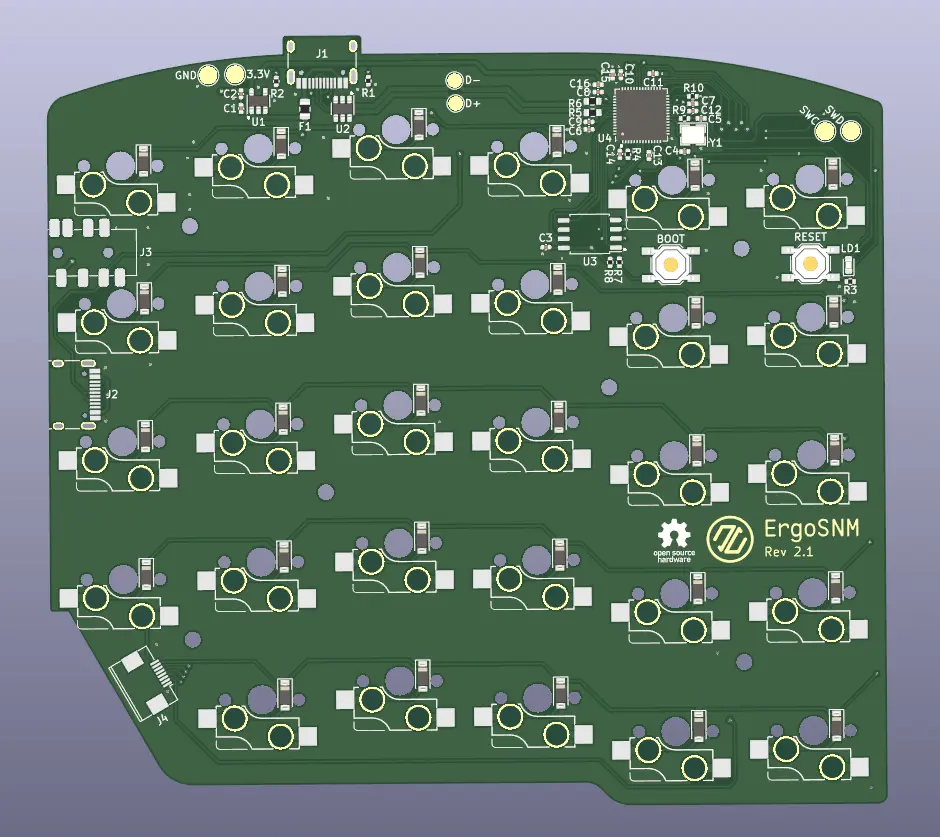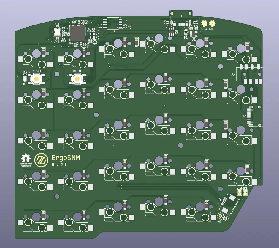 布局参考:整体键盘布局(Layout)融合了 Keebio Iris 与 ZSA Moonlander 的设计精髓,采用 6x5 规格。其 Column-staggered(纵向交错)设计能让手指摆放更加自然、舒适。