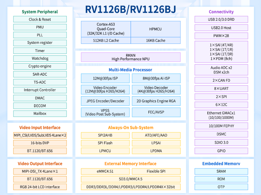 RV1126B/RV1126BJ处理器具备4个Cortex-A53主核,3TOPSNPU以及功能完善的VPU,并且具备丰富的连接能力,适用于端侧AI与边缘计算场景。