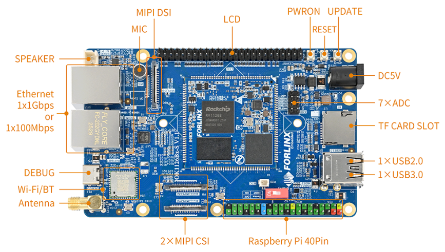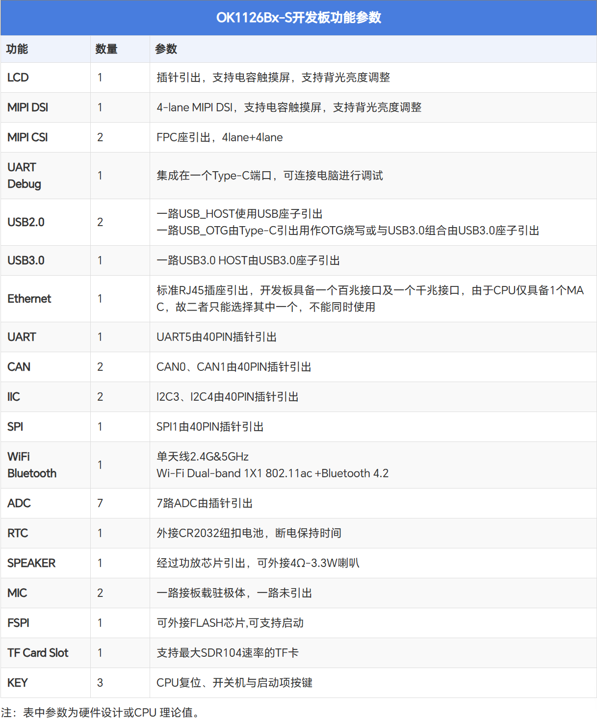 OK1126B-S/OK1126BJ-S开发板尺寸小巧,仅有120mmX75mm,却引出了包括网口、2路MIPICSI、1路MIPIDSI、40Pin树莓派GPI0接口(包括UART、SPI、IIC等多种总线),可以灵活扩展多种外设和传感器模块,非常适合用于嵌入式视觉、边缘计算、智能物联网 (AloT)以及AI推理等应用场景。