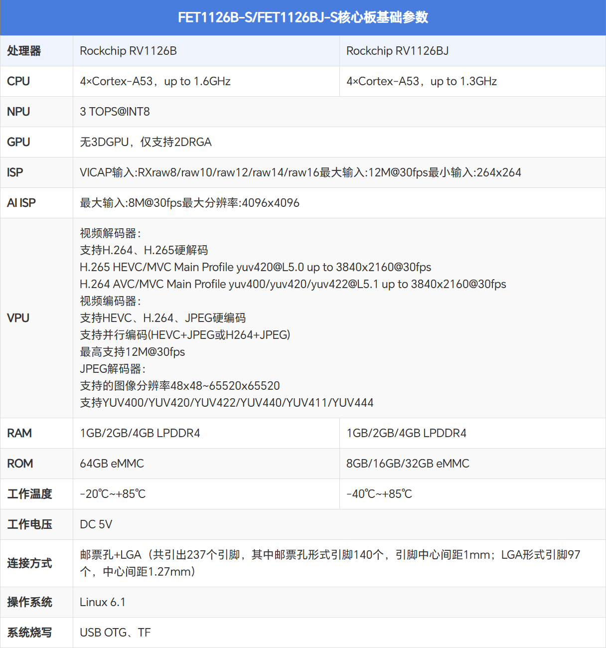 飞凌嵌入式FET1126B-S/FET1126BJ-S 核心板基于Rockchip RV1126B/ RV1126BJ 处理器开发设计,该处理器是瑞芯微专为端侧及边缘侧AI计算处理而打造的一款低功耗、高性价比国产化应用处理器。