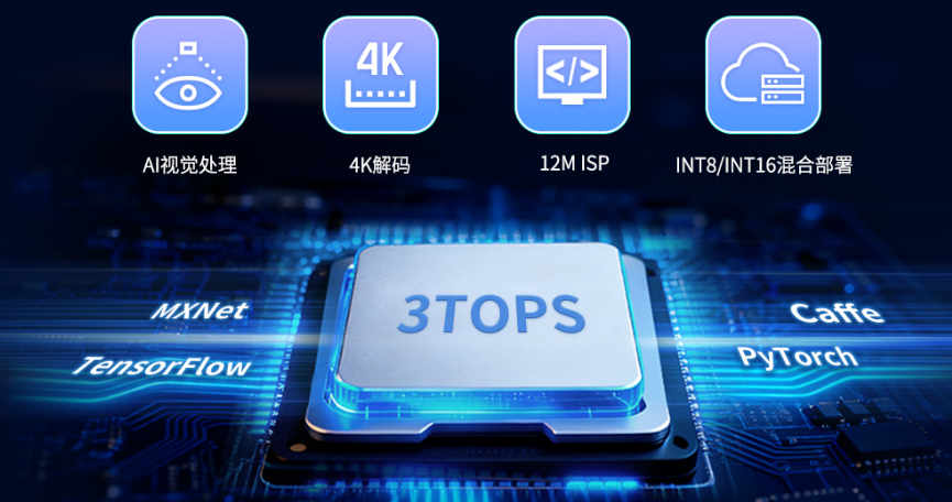 内置独立NPU,提供高达3TOPS@INT8的AI算力,支持INT8/INT16混合精度运算,可高效运行人脸检测、安全帽识别、烟火告警、区域入侵等典型边缘AI目标识别模型,实现本地实时决策,无需依赖云端。