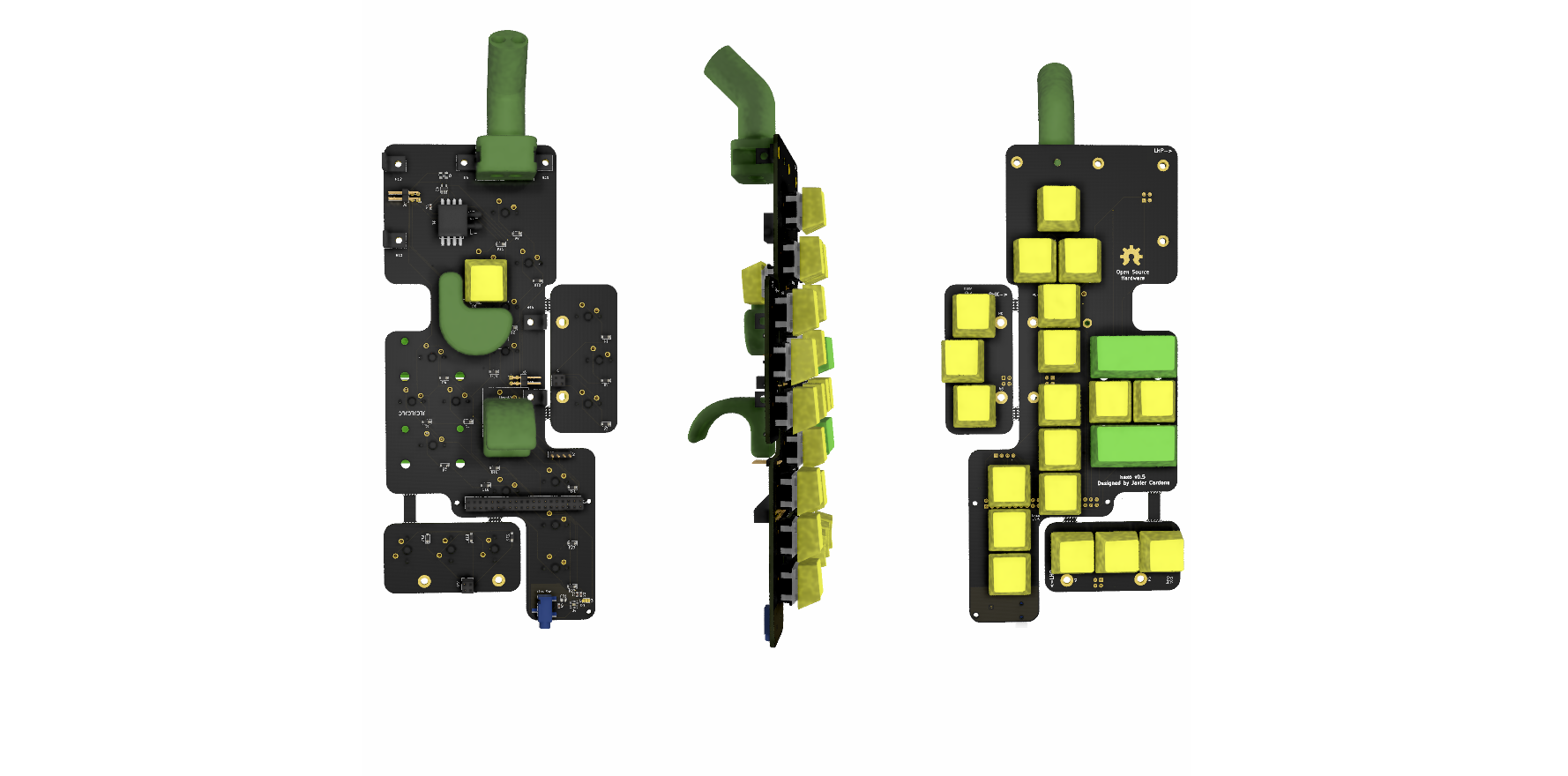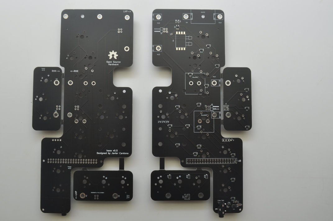 为了降低成本,HAT PCB(印刷电路板)是一体成型的 这是Haxophone的物理结构的一部分。这意味着按键开关, 拇指托、吹嘴和树莓派都直接连接到 印刷电路板。侧键(左手掌键和右指关节键)安装在较小的键上 通过直角金属支架连接到主PCB上。这个更小 PCB是设计中可拆卸的面板。这会降低 制造成本。