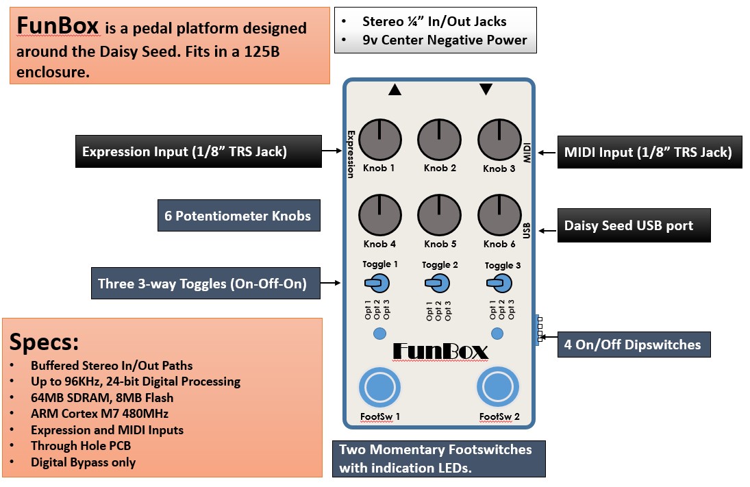 Funbox的硬件组件(1/4英寸立体声音频插孔、电源插孔、旋钮、开关)(我喜欢LoveMySwitches)
