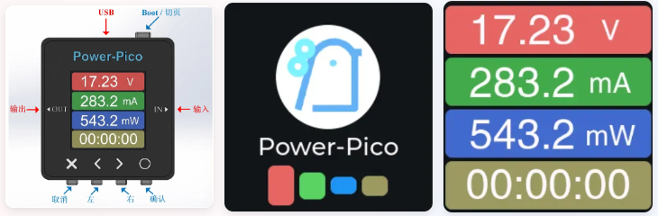 Power-Pico的按键操作说明,和各个界面展示,如下图所示。顶部按键为 换页/Boot 按键,长按住顶部按键再上电,会直接进入Boot模式强制升级模式。Power-Pico硬件目前只支持 中文简体/English 2种语言。