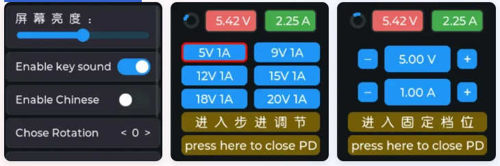 在设置界面中选中PD诱骗,然后点击确认,等待诱骗成功则可进入PPS界面。PPS界面顶部显示的是当前工作的电压和电流。你可以在PPS界面中设置预设好的电压和步进调节电压,这样就可以充当可调电源了。注意:目前只支持 PPS 诱骗!测试时需要看下充电头协议支持!