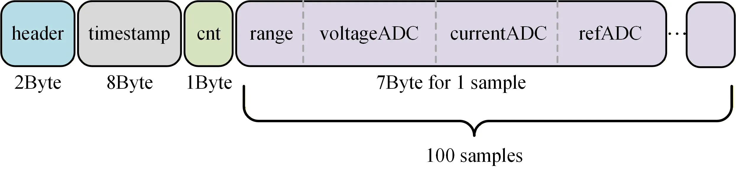 └── MDK-ARM/ # [工程文件] Keil MDK 工程配置文件使用USB进行高速数据传输,数据包组成如下图所示。每个数据包100(可在代码中更改)组数据,加上头共计711Bytes。