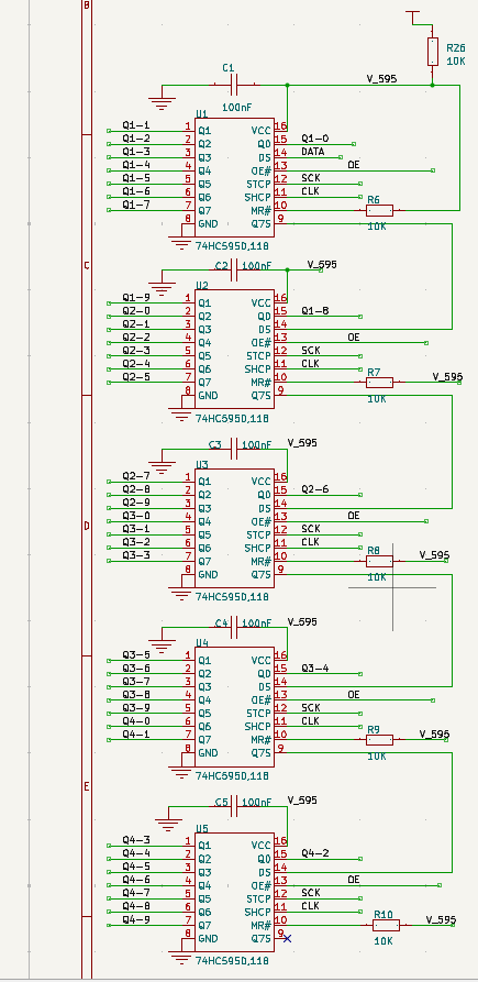 将STM32输出的串行数据(SDA/SCK)转换为并行输出,驱动 4 组辉光管的阴极三极管。5 片 74HC595 级联,U1 的 Q7' 输出连接到 U2 的 DS,U2 的 Q7' 连接到 U3 的 DS,以此类推,形成 40 位的移位寄存器链。STM32 通过SCK时钟脉冲,将 40 位串行数据依次移入5片74HC595。