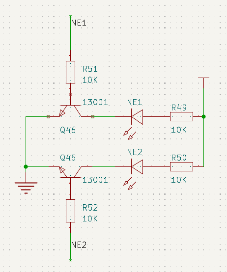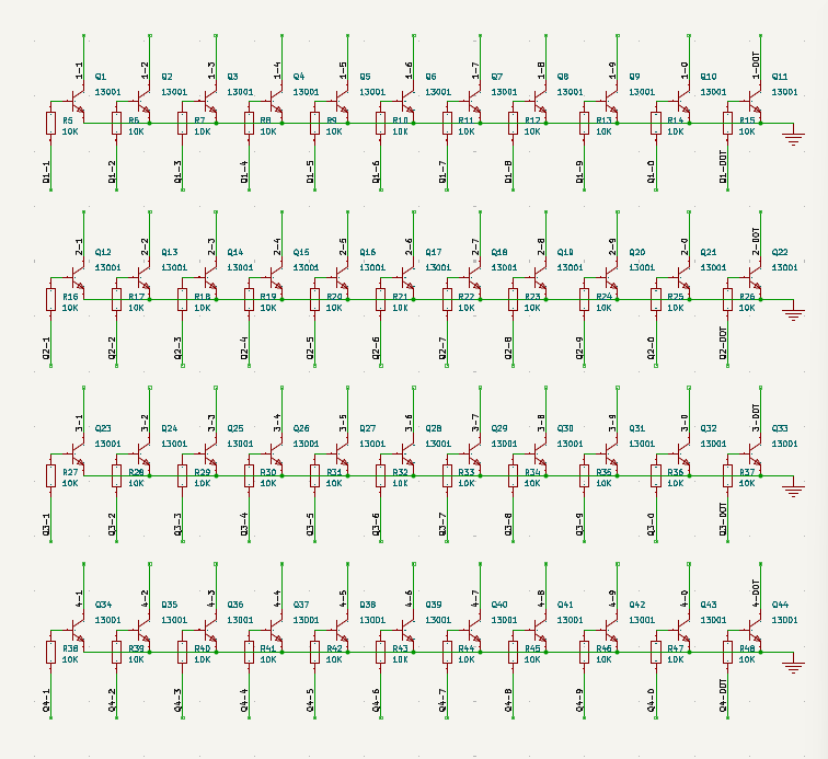 采用44只13001高压三极管,每只对应辉光管的一个阴极,包括4个小数点。当595输出高电平时,三极管导通,对应辉光管阴极接地,形成电流通路;输出低电平时,三极管截止,阴极悬空。辉光管的阳极统一连接到170V电源,通过20k限流电阻限制电流,防止过流损坏。