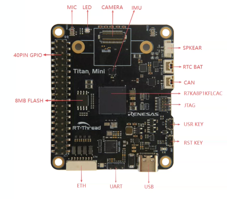 主控芯片:Titan Board 采用瑞萨 RA8P1 芯片,是一个 32 位 AI 加速微控制器 (MCU),具有带 TSN 的高级 2 端口千兆以太网交换机,拥有 Helium™ 矢量扩展和 TrustZone 技术的加持,并集成 Ethos™-U55 NPU AI 神经网络处理单元。