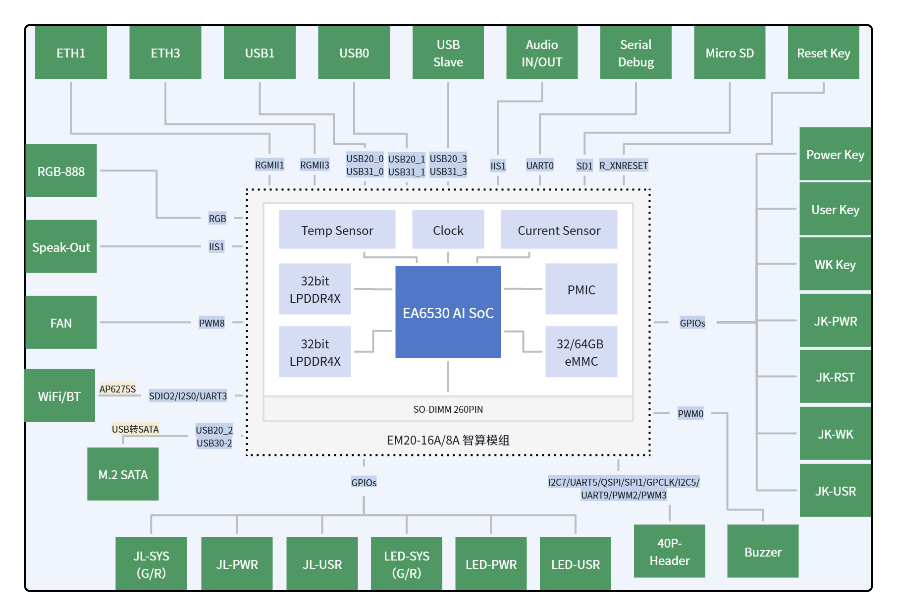 EM20-DK 开发者套件是基于 MES20 智算模组,并扩展了常用的外设接口,为用户提供易用的 AI 产品原型的评估平台。系统框图如下图所示: